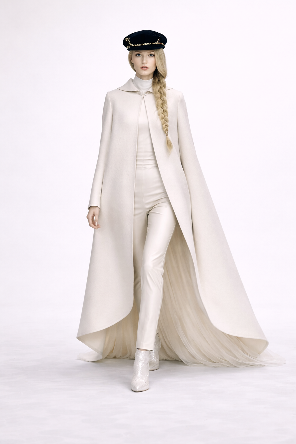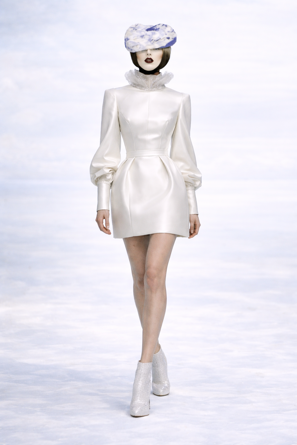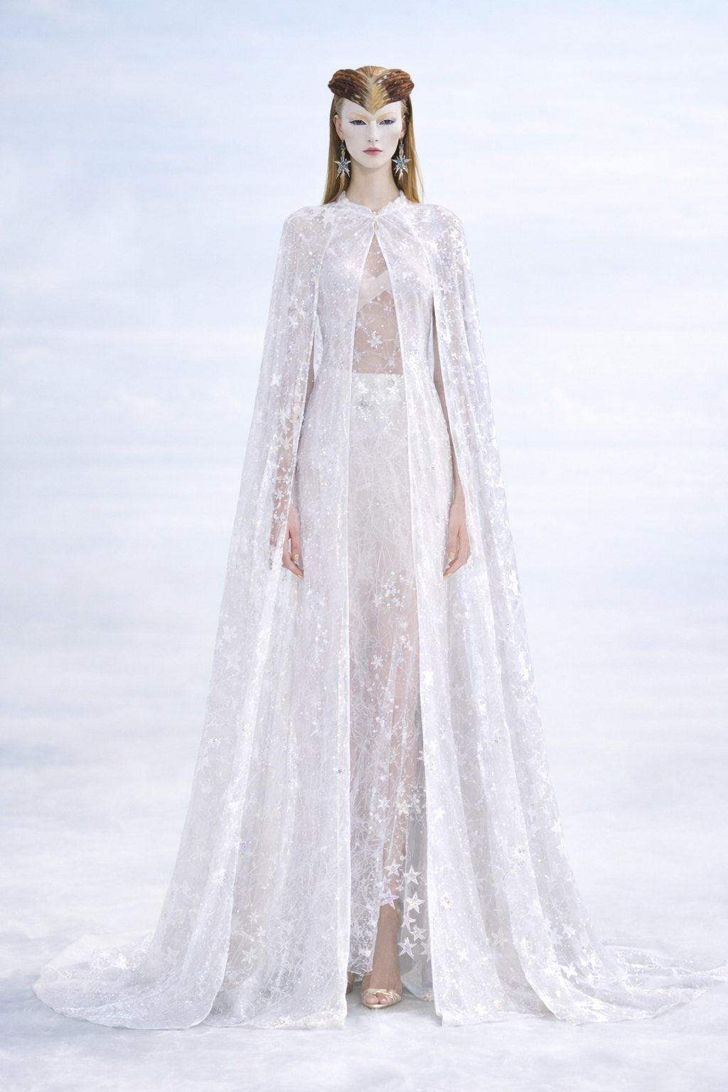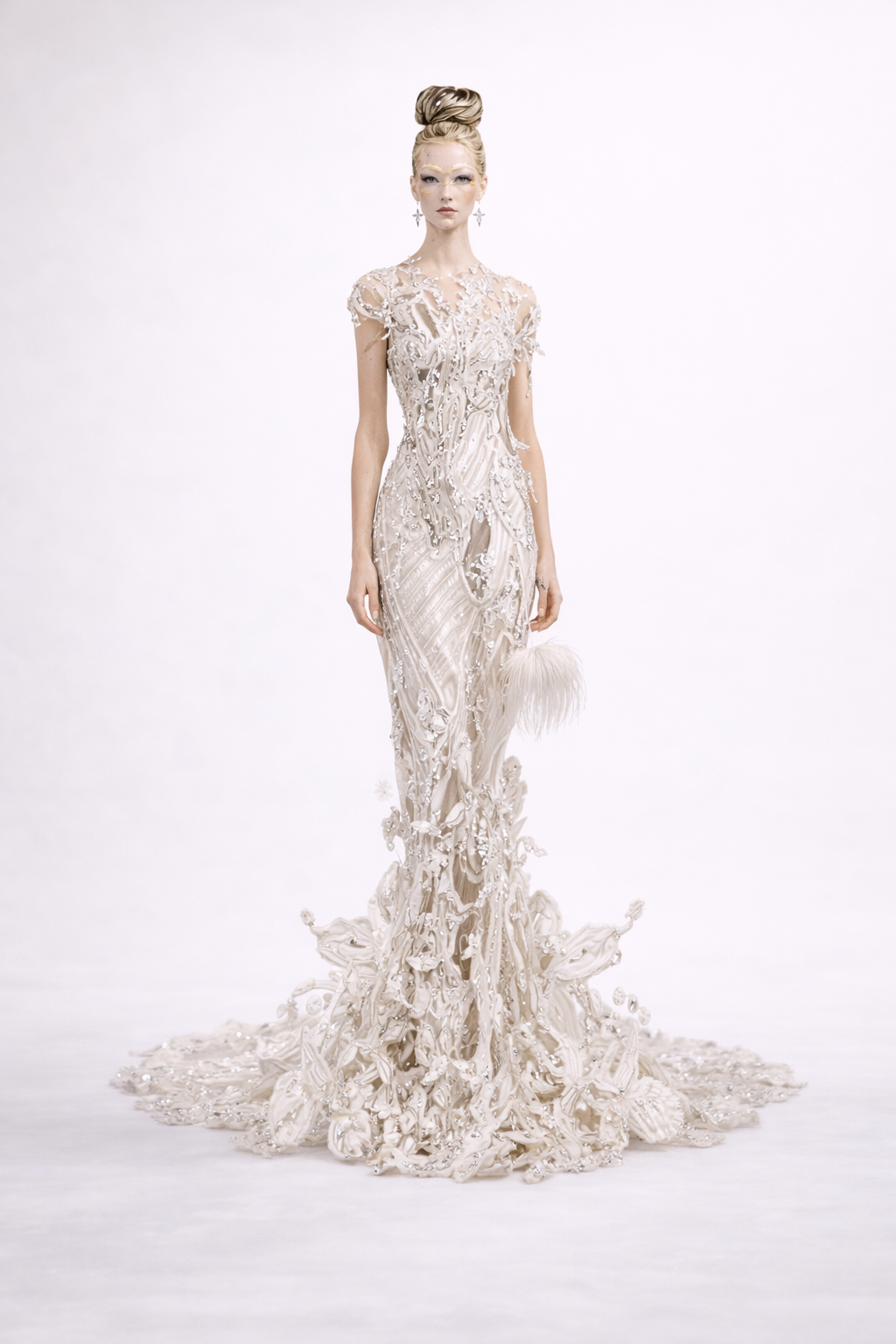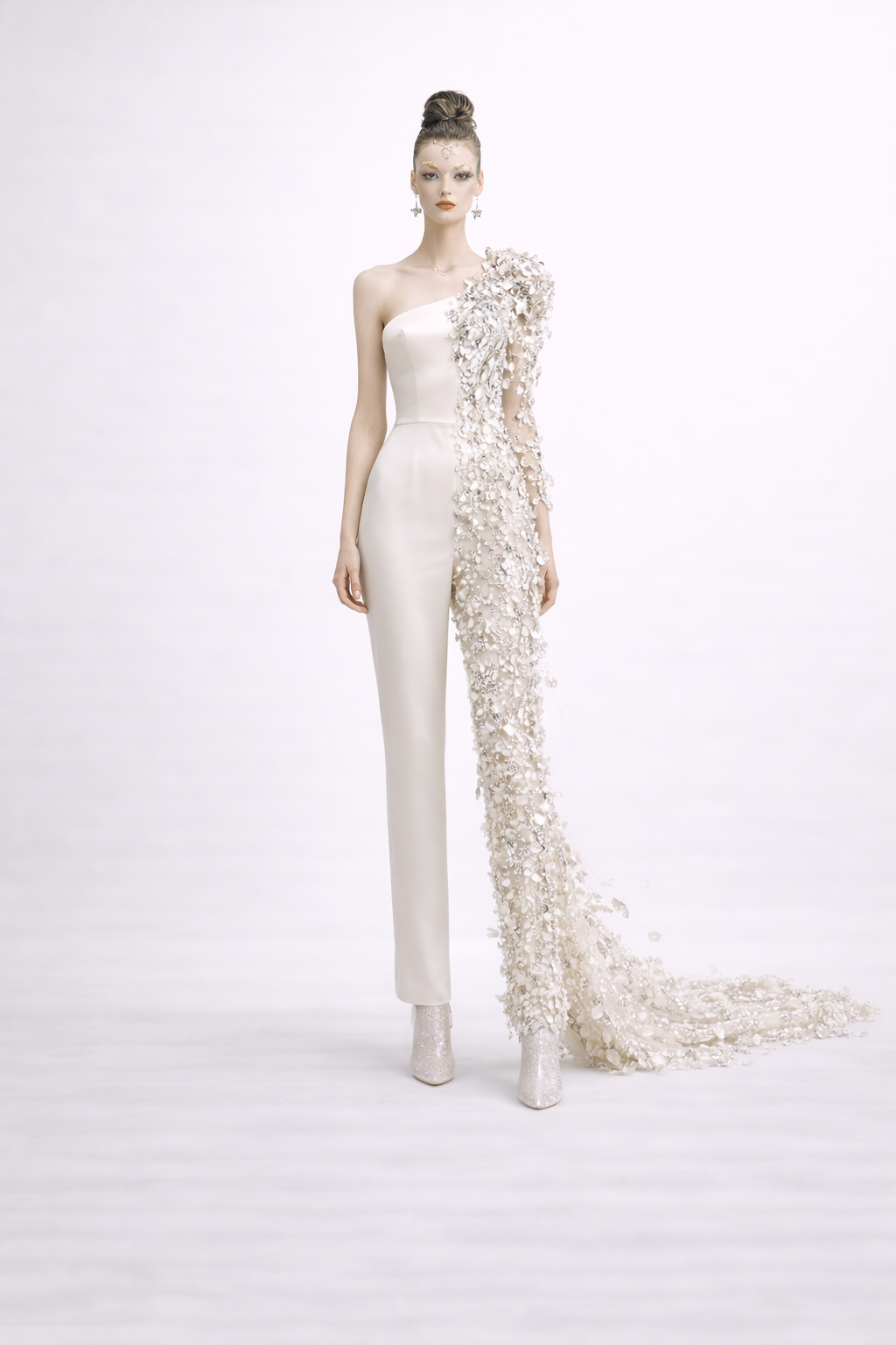 This collection follows that same philosophy: restrained ivory tones, sculptural silhouettes, and soft satin and sheer textures that frame the wearer rather than overpower her.